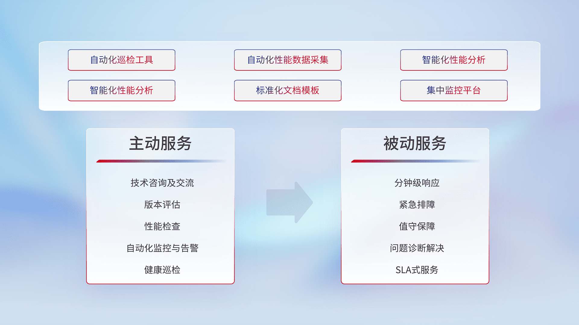 智能化工具和标准化文档,,,保障服务质量,,,,提供主动服务(包含技术咨询、、、版本评估、、、、性能检查、、自动化监控与告警、、、健康巡检)和被动服务包含(分钟级响应、、、、紧急排障、、、、值守保障、、问题诊断解决、、、、SLA服务)。。